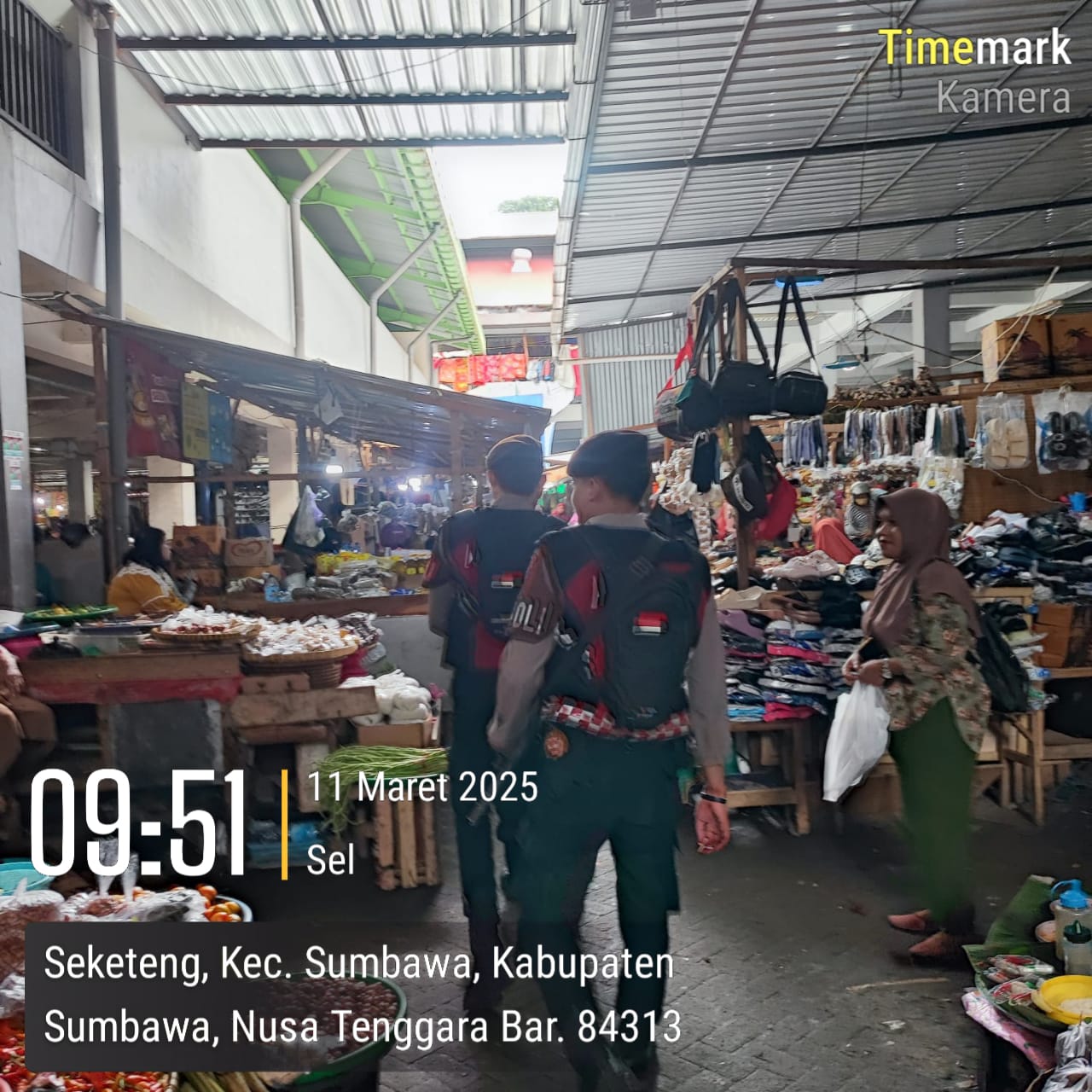 Sumbawa Besar –NTB,  Dalam rangka menjaga keamanan dan ketertiban selama Bulan Suci Ramadhan, personel Unit Patroli Samapta Polres Sumbawa melaksanakan patroli di Pasar Seketeng, Sumbawa, Selasa (11/03/25) pagi.