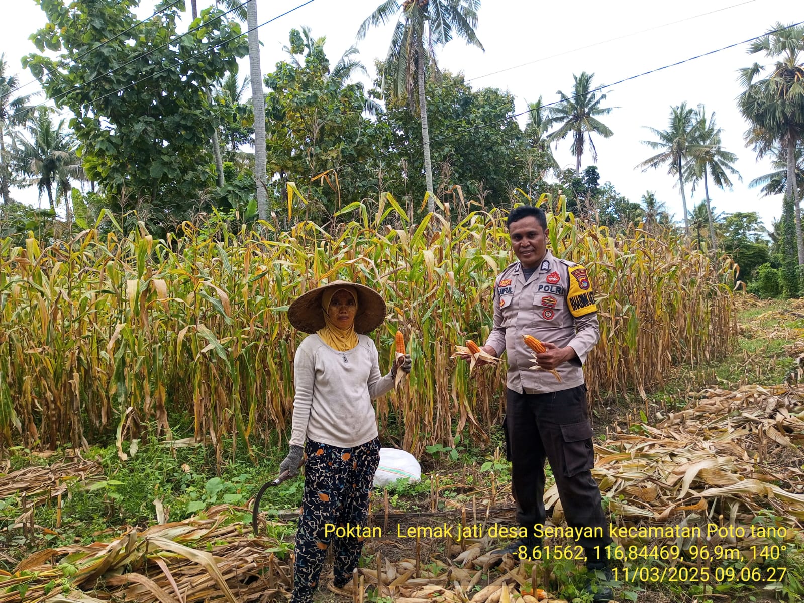 Sumbawa Barat, NTB – Dalam rangka mendukung ketahanan pangan di wilayahnya, Bhabinkamtibmas Desa Senayan, bersama dengan Penyuluh Pertanian Lapangan (PPL) Desa Senayan, melaksanakan pendampingan panen jagung di Kelompok Tani Alam Subur II dan Kelompok Tani Lemak Jati, yang terletak di Dusun Ai Olat Senayan Bawah, Desa Senayan, Kecamatan Poto Tano, Kabupaten Sumbawa Barat, pada Selasa, 11 Maret 2025.