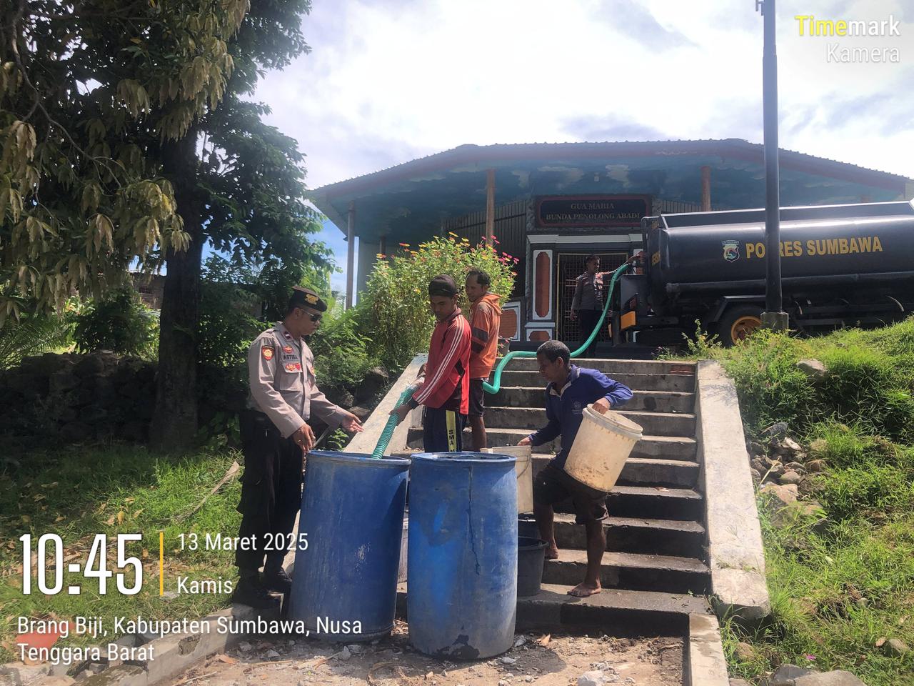 Sumbawa Besar – NTB, Dalam rangka mendukung proses pembangunan fasilitas umum, Sat Samapta Polres Sumbawa memberikan bantuan air bersih bertempat di pemakaman Katolik Gua Maria Bunda Penolong Abadi Kelurahan Brangbiji Sumbawa, Kamis (13/03/25).