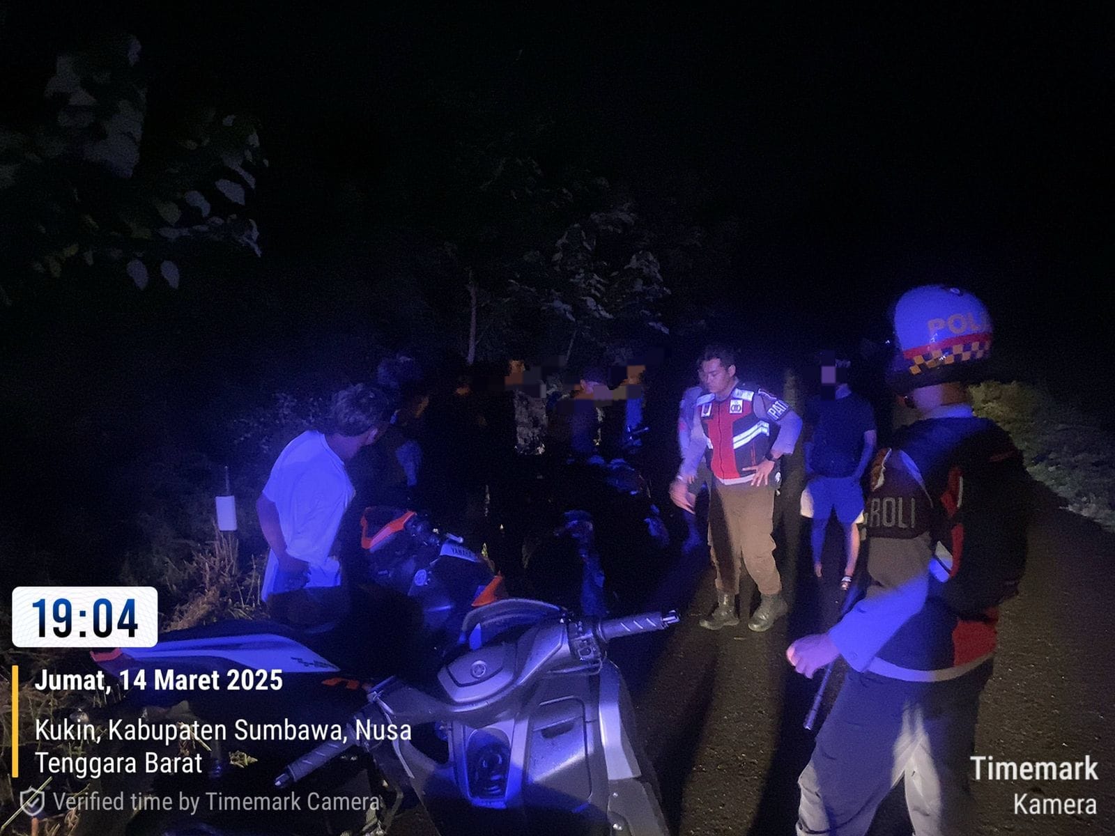 Sumbawa Besar–NTB, Personel Unit Patroli Samapta Polres Sumbawa berhasil menggagalkan aksi balap liar yang dilakukan oleh sejumlah remaja di Jembatan Limung, Kecamatan Moyo Hilir, Kabupaten Sumbawa,NTB, pada Jumat malam, 14 Maret 2025, sekitar pukul 19:04 WITA. Aksi balap liar yang berlangsung di lokasi tersebut sempat mengganggu arus lalu lintas dan menimbulkan keresahan di kalangan masyarakat sekitar.