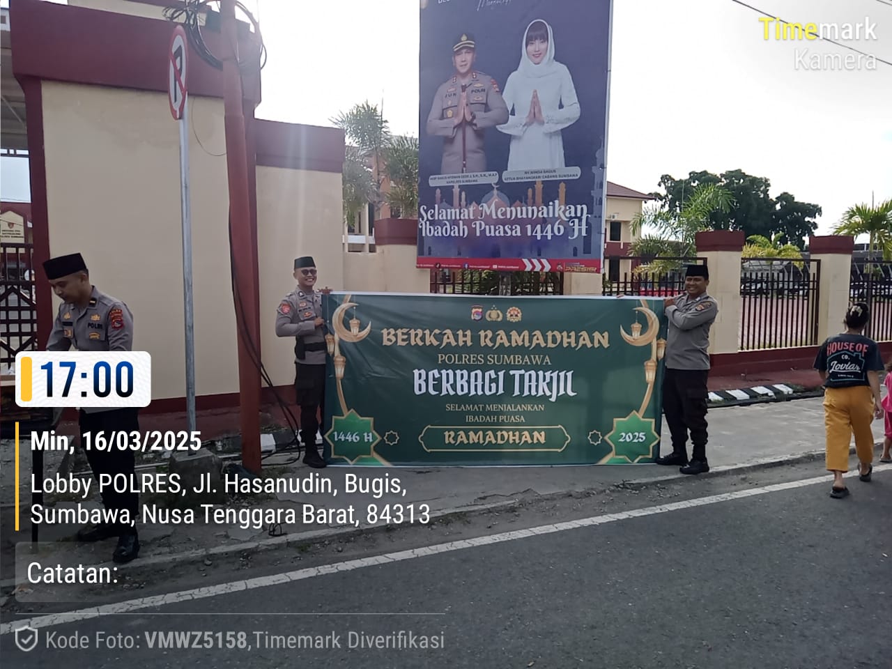 Sumbawa Besar–NTB, Moment penuh berkah, personel Polres Sumbawa yang terdiri dari gabungan satuan fungsi melaksanakan kegiatan sosial dengan membagikan paket takjil gratis kepada masyarakat dan pengendara yang melintas di depan Mapolres Sumbawa, Minggu (16/03/25).