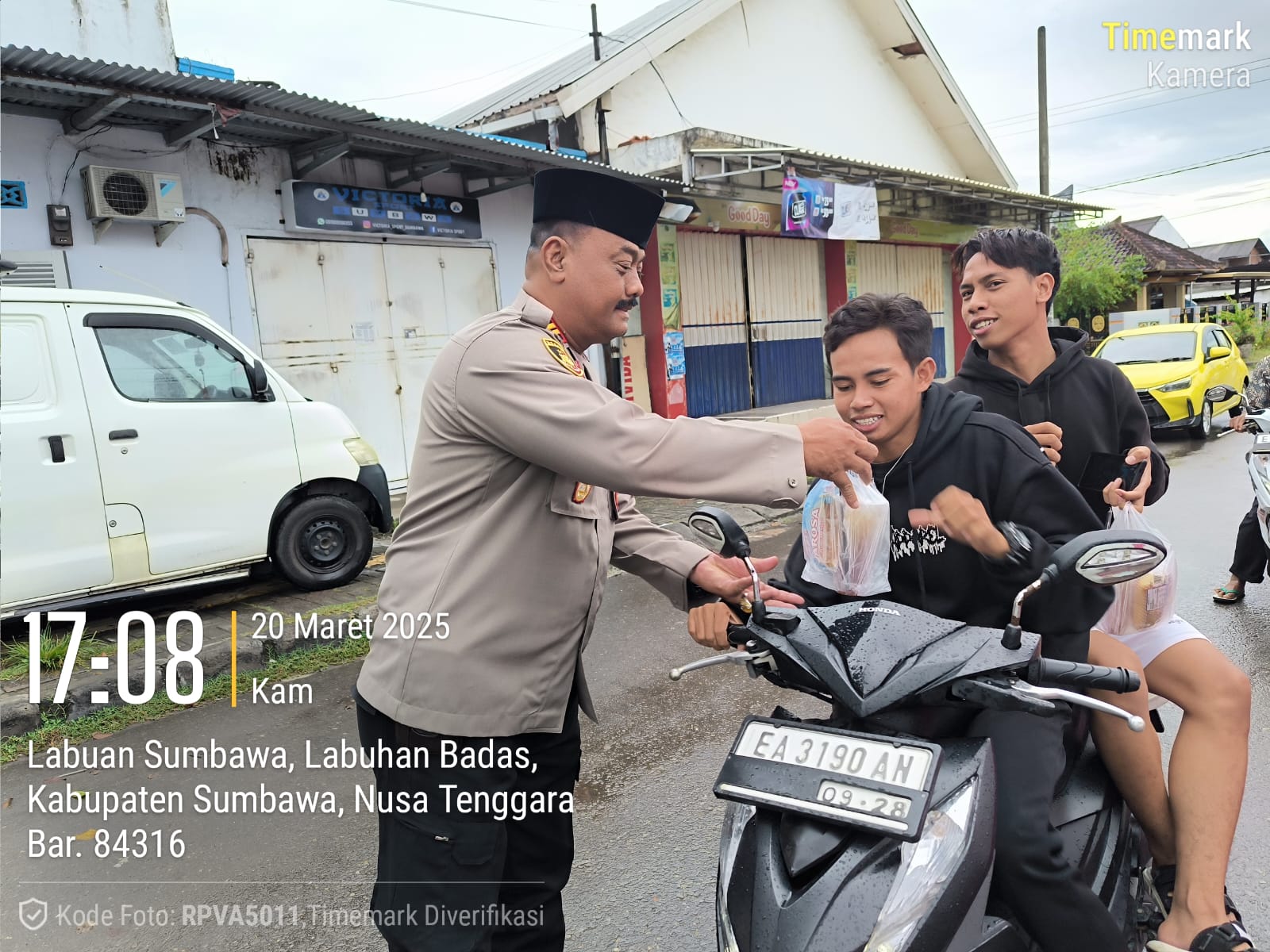 Sumbawa Besar-NTB, Dalam rangka menyemarakkan bulan Ramadhan, Polsek Labuhan Badas jajaran Polres Sumbawa melaksanakan kegiatan pembagian takjil kepada masyarakat yang tengah menjalankan ibadah puasa pada Kamis (20/03/25) sore.