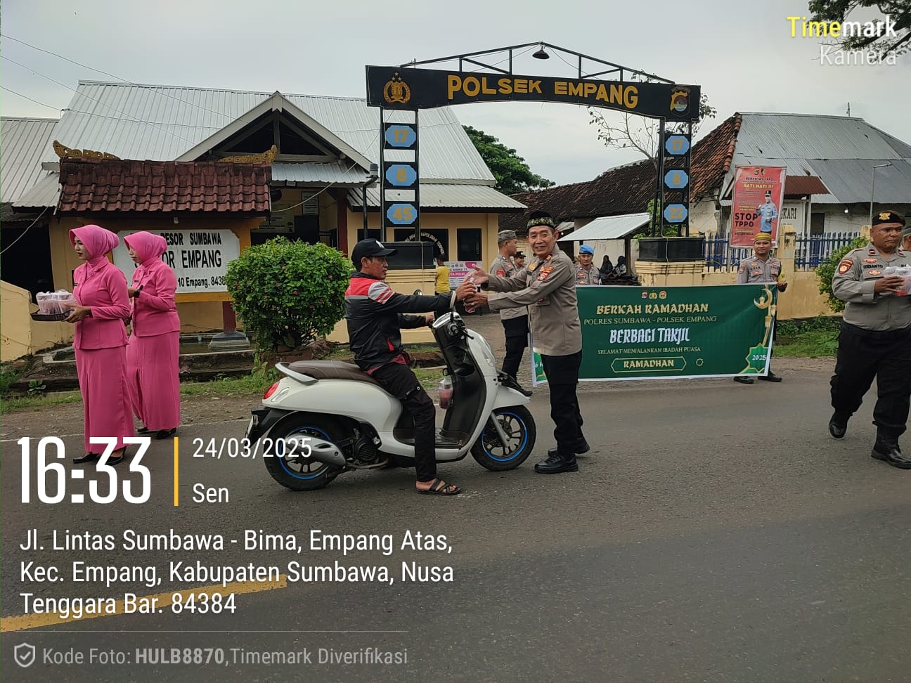 Sumbawa Besar–NTB, Polsek Empang dan Polsek Labangka jajaran Polres Sumbawa melaksanakan kegiatan sosial berupa pembagian takjil kepada masyarakat yang tengah menjalankan ibadah puasa, Senin (24/03/25).