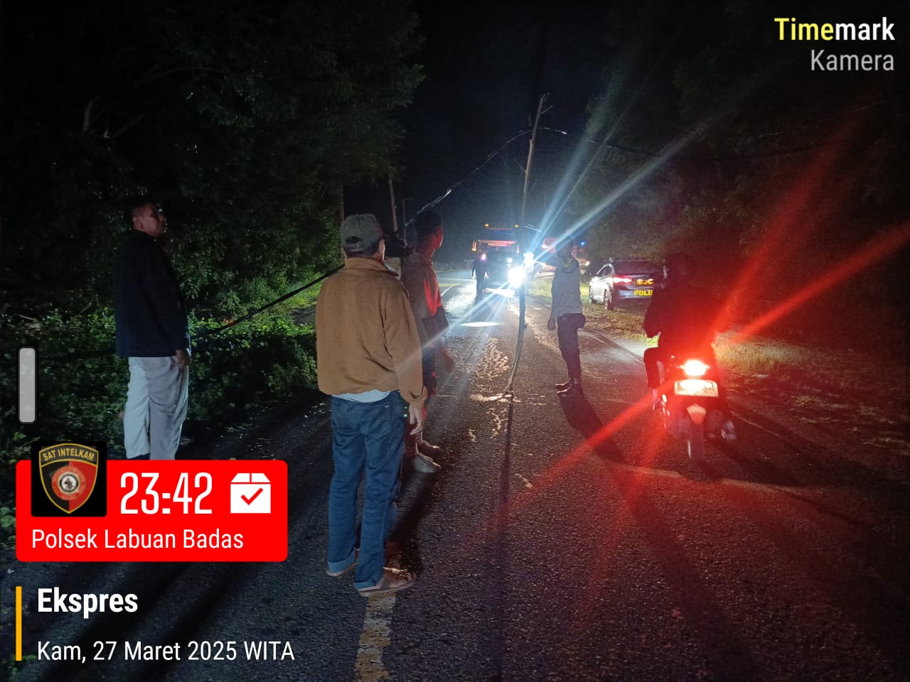 Personel Polsek Labuhan Badas dan warga melakukan upaya pertama dengan mengangkat kabel yang jatuh menggunakan alat seadanya, seperti kayu dan tangga yang dijadikan tiang pancang untuk menopang kabel tersebut. Langkah ini dilakukan agar kendaraan yang sebelumnya terhambat dapat melintas dengan lancar dan aman, sambil menunggu kedatangan petugas PLN untuk menangani kabel listrik tersebut secara profesional.