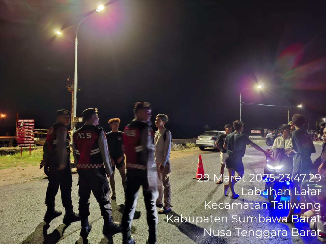 Sumbawa Barat, NTB – Menjelang Hari Raya Idul Fitri, Unit Patroli Sat Samapta Polres Sumbawa Barat intensifkan patroli di berbagai titik wilayah, salah satunya di Dermaga Labuhan Lalar, Kecamatan Taliwang, Kabupaten Sumbawa Barat. Pada hari Sabtu, 29 Maret 2025 pukul 23.00 WITA, petugas patroli mendatangi sekelompok remaja yang sedang berkumpul di lokasi tersebut.