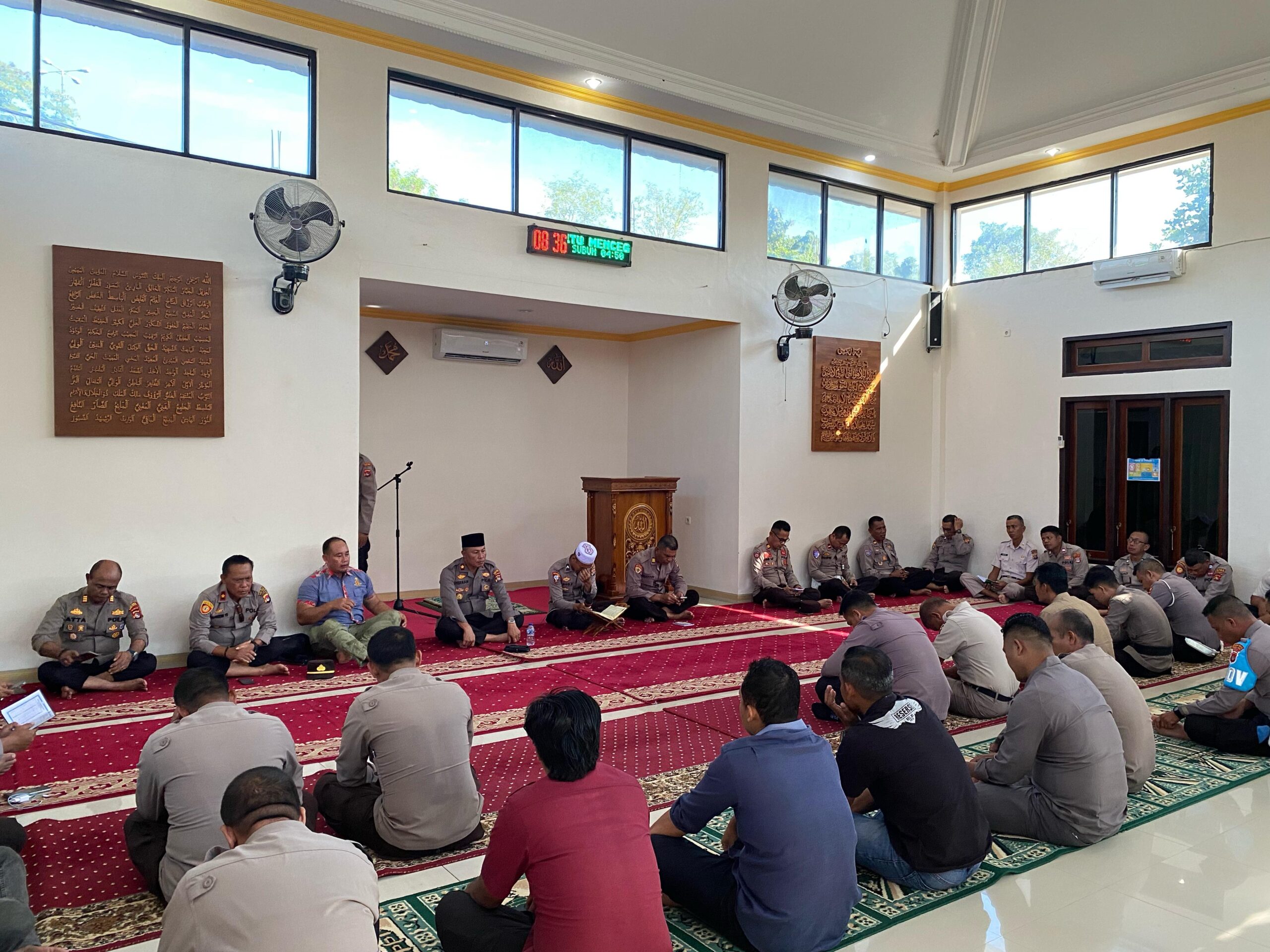 Kegiatan dibuka Wakapolres Kompol Herman, S.H., kemudian dilanjutkan pembacaan Surah Yasin yang dipandu Bripda Ridho Ramdani. Suasana khidmat tampak menyelimuti masjid, diikuti seluruh personel yang hadir.
