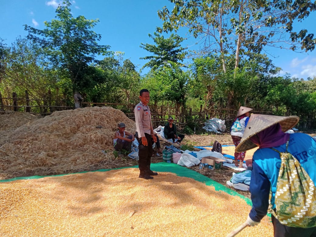 Bhabinkamtibmas Desa Woko, Aipda Munawir, memantau panen jagung milik Sahlan di lahan seluas 1 hektare di So Sambi Mboko, Dusun Woko Rahmat, Kecamatan Pajo, Jumat (25/4/2025) pukul 11.00 Wita.