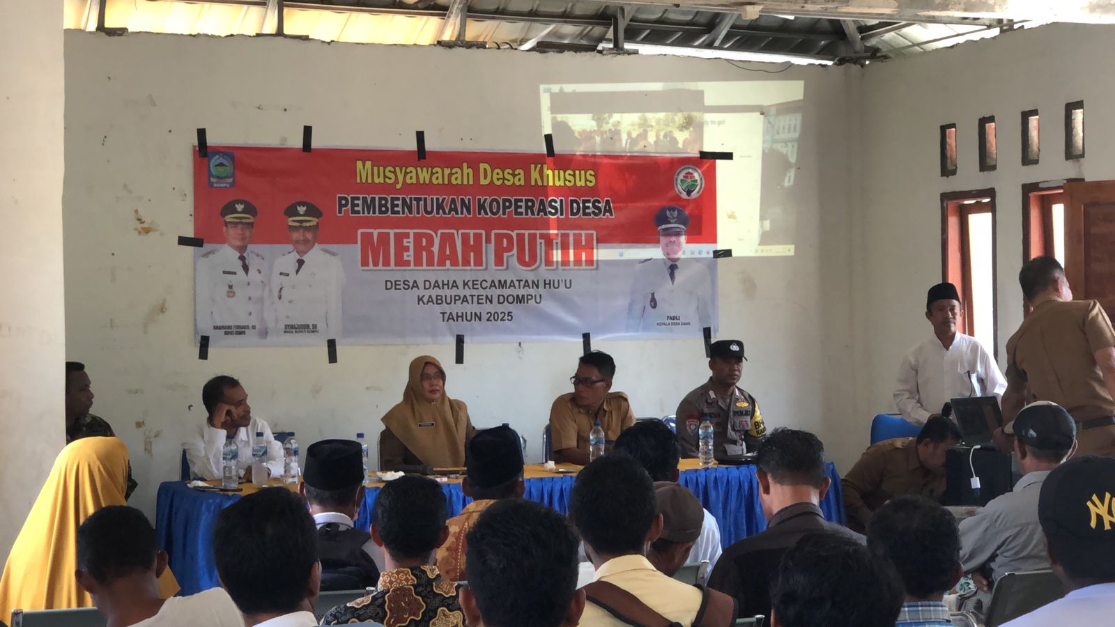 Bhabinkamtibmas Desa Daha Polsek Hu’u, Bripka Adi Setiadi, menghadiri kegiatan Musyawarah Desa (Musdes) khusus dalam rangka Pembentukan Koperasi Merah Putih Desa Daha Tahun 2025. Kegiatan ini berlangsung di Aula Kantor Desa Daha, Kecamatan Hu’u, Kabupaten Dompu, pada Senin (28/04/2025) sekitar pukul 08.30 WITA.