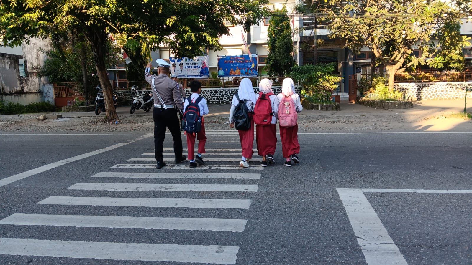 “Personel kami dikerahkan di sejumlah titik persimpangan jalan maupun kawasan padat aktivitas untuk melakukan pengaturan lalu lintas dan membantu penyebrangan pejalan kaki, termasuk para pelajar,” ujar Iptu Bambang Tedy.