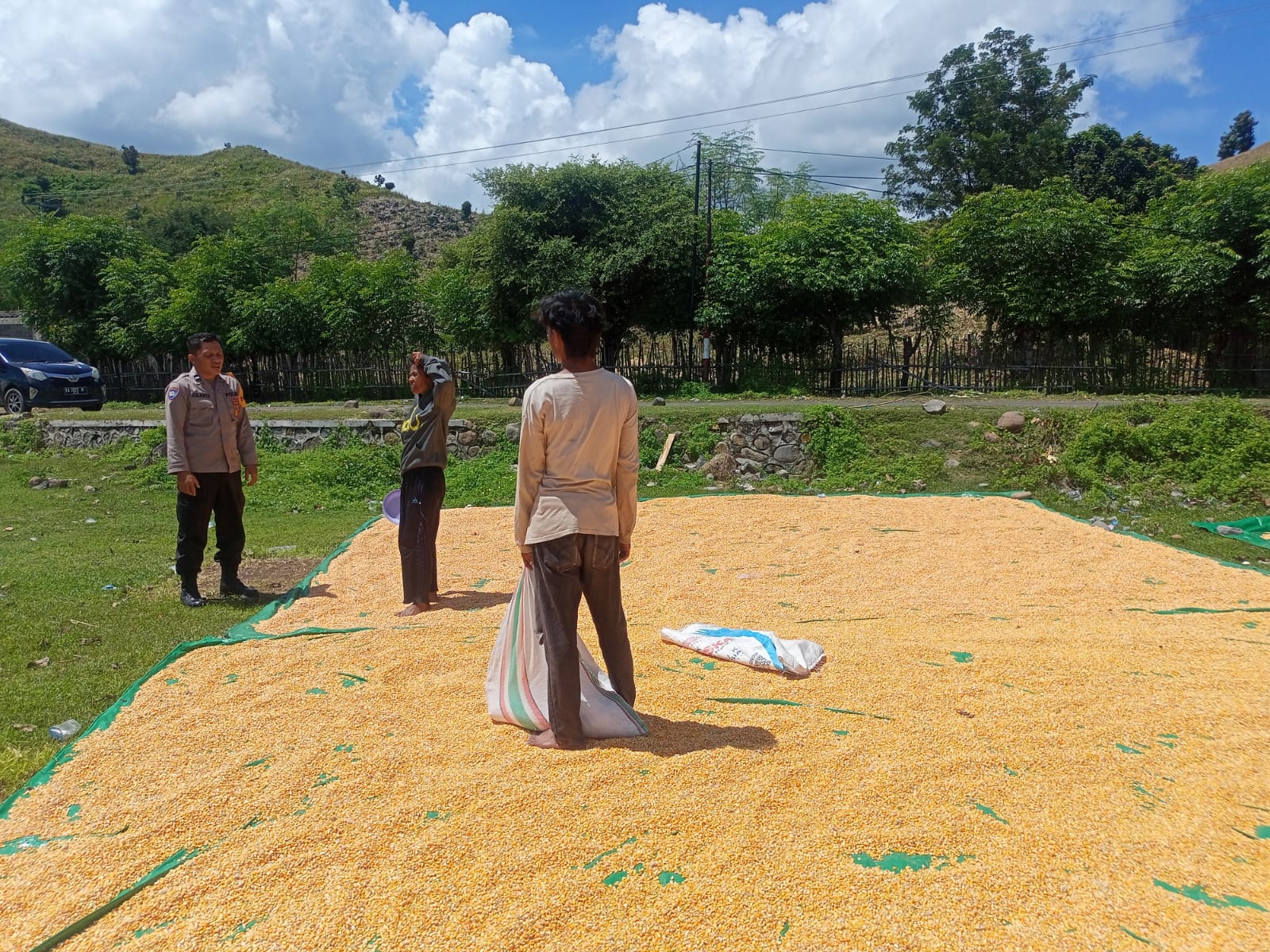 Dalam kegiatan tersebut, Bhabinkamtibmas turut menyaksikan proses penjemuran jagung hasil panen milik salah satu warga, Sdr. Abdul Hamid. Penjemuran merupakan tahap penting dalam menjaga kualitas hasil panen, khususnya dalam menjaga kadar air jagung agar tetap sesuai standar yang ditetapkan saat penimbangan dan penyimpanan.