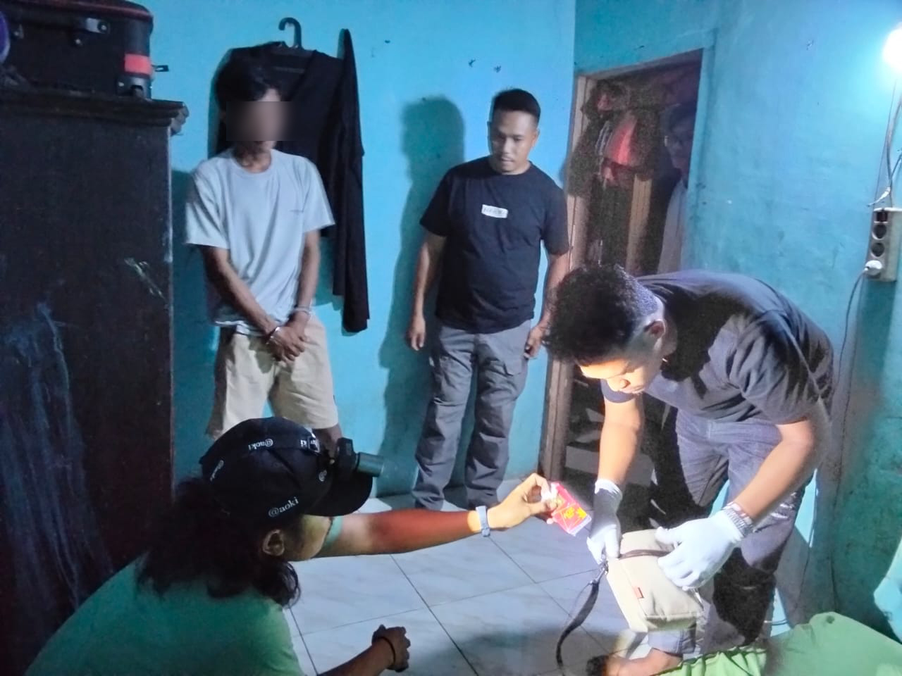 Setelah dilakukan pengintaian dan memastikan keberadaan target, pada pukul 17.00 Wita tim langsung bergerak dan menemukan terduga MI sedang tertidur bersama pasangannya di dalam kamar.