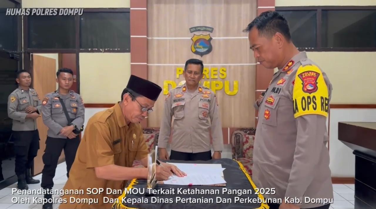 Dalam rangka mendukung program ketahanan pangan nasional menuju Indonesia Emas 2045, Polres Dompu bersama Dinas Pertanian dan Perkebunan Kabupaten Dompu resmi menandatangani Nota Kesepahaman (MoU) dan Standar Operasional Prosedur (SOP) Ketahanan Pangan Tahun 2025. Kegiatan tersebut dilaksanakan pada Senin, 16 Juni 2025, pukul 13.30 WITA di lobi Mapolres Dompu.