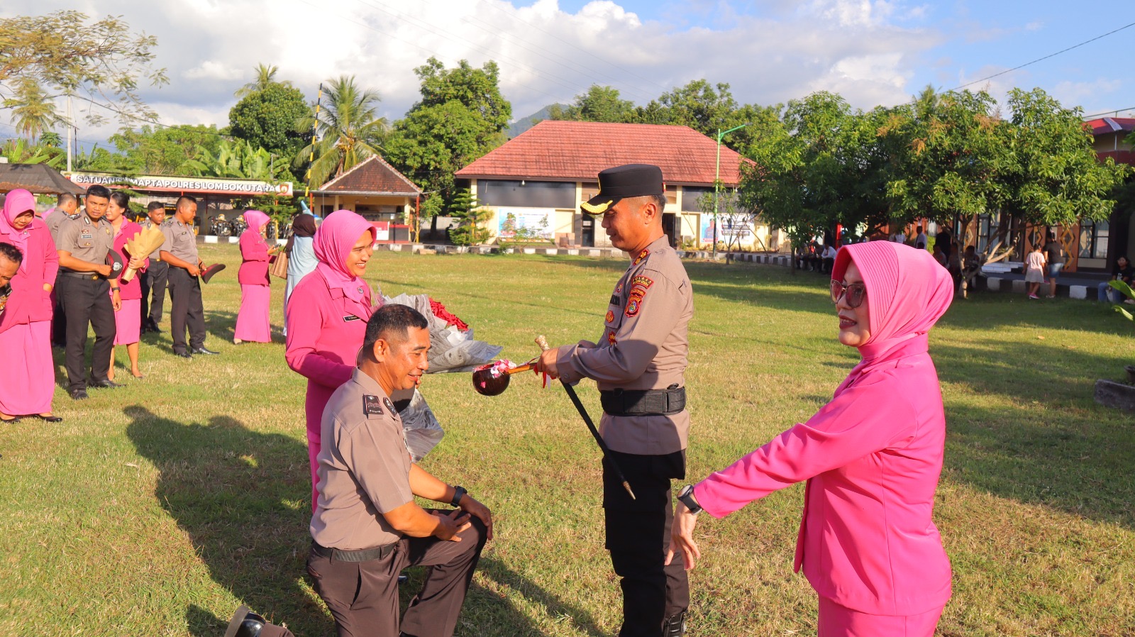 Usai upacara, dilaksanakan prosesi penyiraman kembang sebagai simbol penyucian diri dan awal tanggung jawab baru. Penyiraman dilakukan oleh Kapolres Lombok Utara didampingi Ketua Bhayangkari Cabang Lombok Utara.