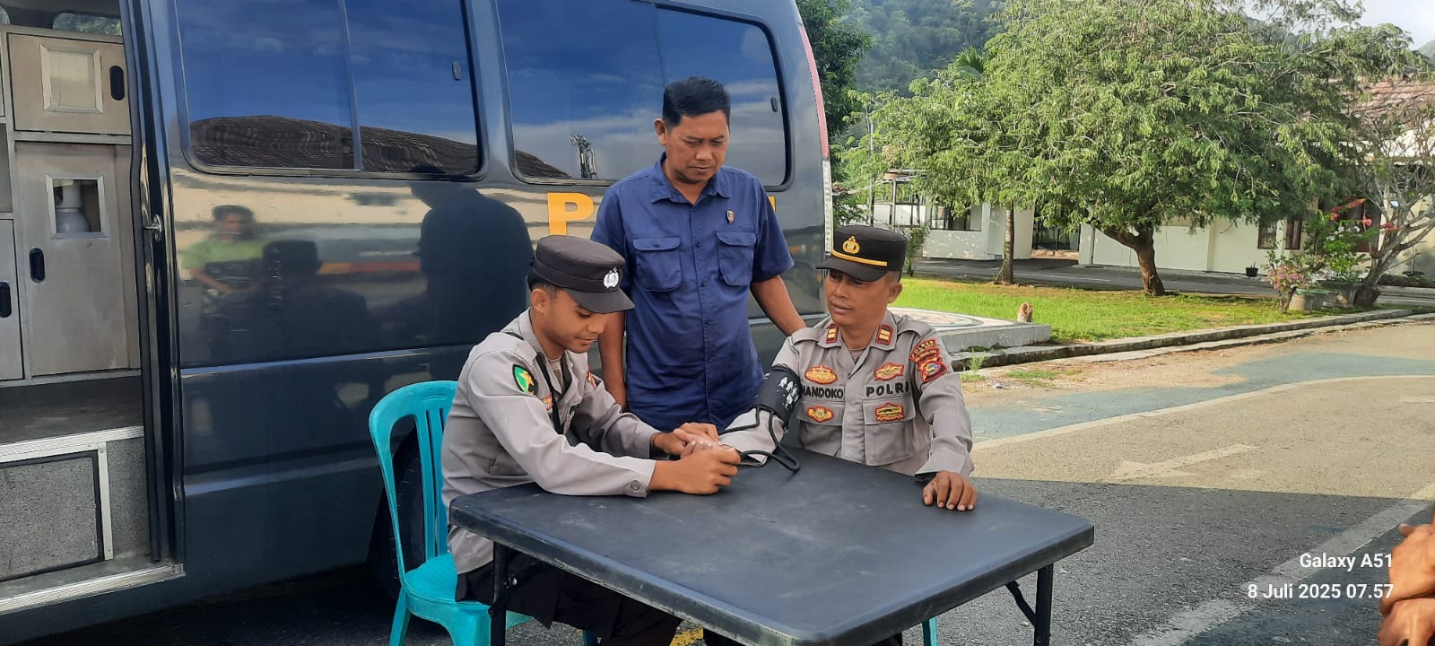 Seperti yang terlihat pada Selasa pagi, 8 Juli 2025, petugas kesehatan dari Sidokes Polres Sumbawa Barat melaksanakan pemeriksaan tensi dan detak jantung kepada personil yang mendaftar untuk dilakukan pemeriksaan awal sebelum pelaksanaan apel pagi di Lapangan Wicaksana Laghawa.
