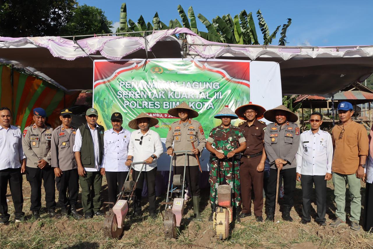 Kota Bima, NTB (10 Juli 2025) – Kapolres Bima Kota AKBP Didik Putra Kuncoro, S.I.K., M.Si bersama jajaran Polres Bima Kota melaksanakan kegiatan Penanaman Jagung Serentak Kuartal III Tahun 2025 pada Kamis (10/7), sekitar pukul 15.00 WITA, yang bertempat di lahan perhutanan sosial Desa Rato, Kecamatan Lambu, Kabupaten Bima.