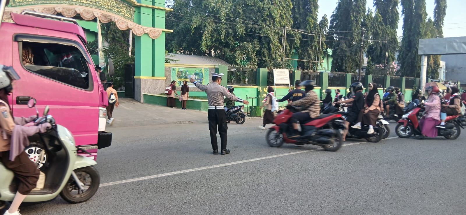 Selain melakukan pengaturan lalu lintas, personel di lapangan juga aktif menyapa masyarakat, memberikan imbauan tertib berlalu lintas, serta membantu menyeberangkan pelajar dan masyarakat yang melintas di sekitar lokasi.