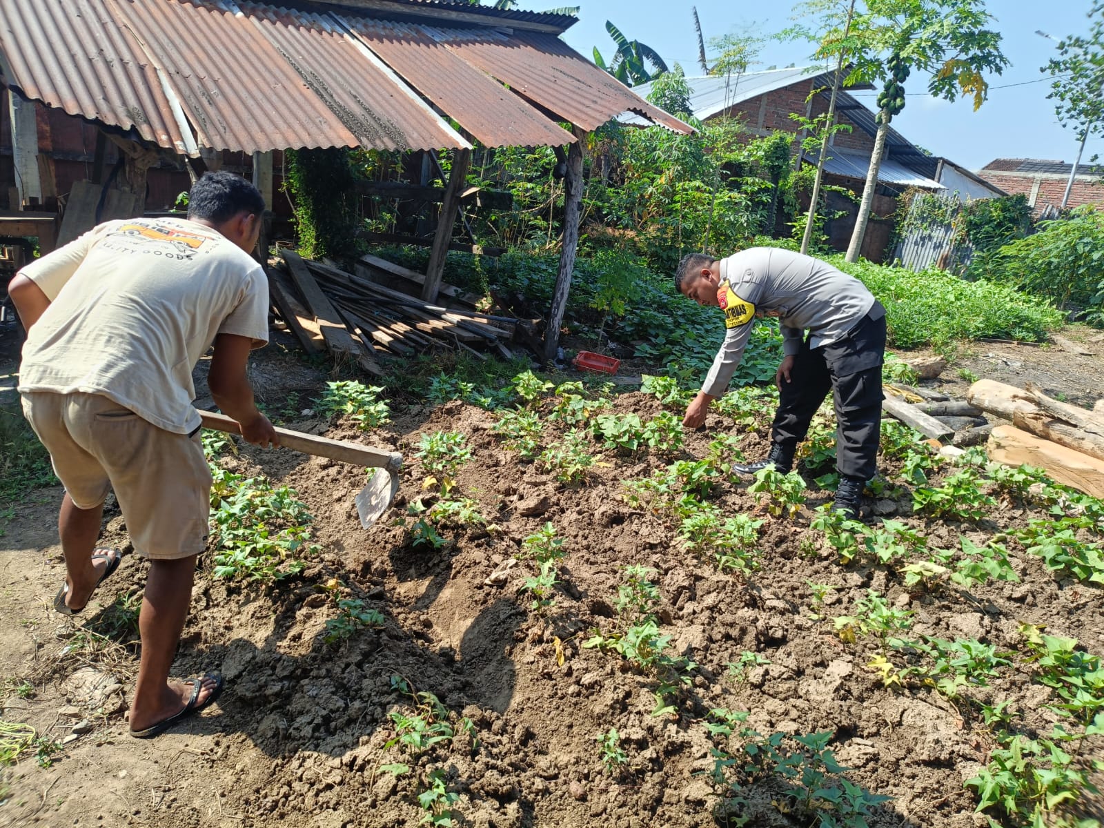 Sumbawa Barat, NTB – Dalam upaya mendukung program ketahanan pangan nasional, Polsek Seteluk, Polres Sumbawa Barat melalui Bhabinkamtibmas Desa Tapir terjun langsung memantau sekaligus membantu pengolahan lahan pekarangan bergizi milik warga binaan di Desa Tapir, Kecamatan Seteluk, Minggu (03/08/2025).