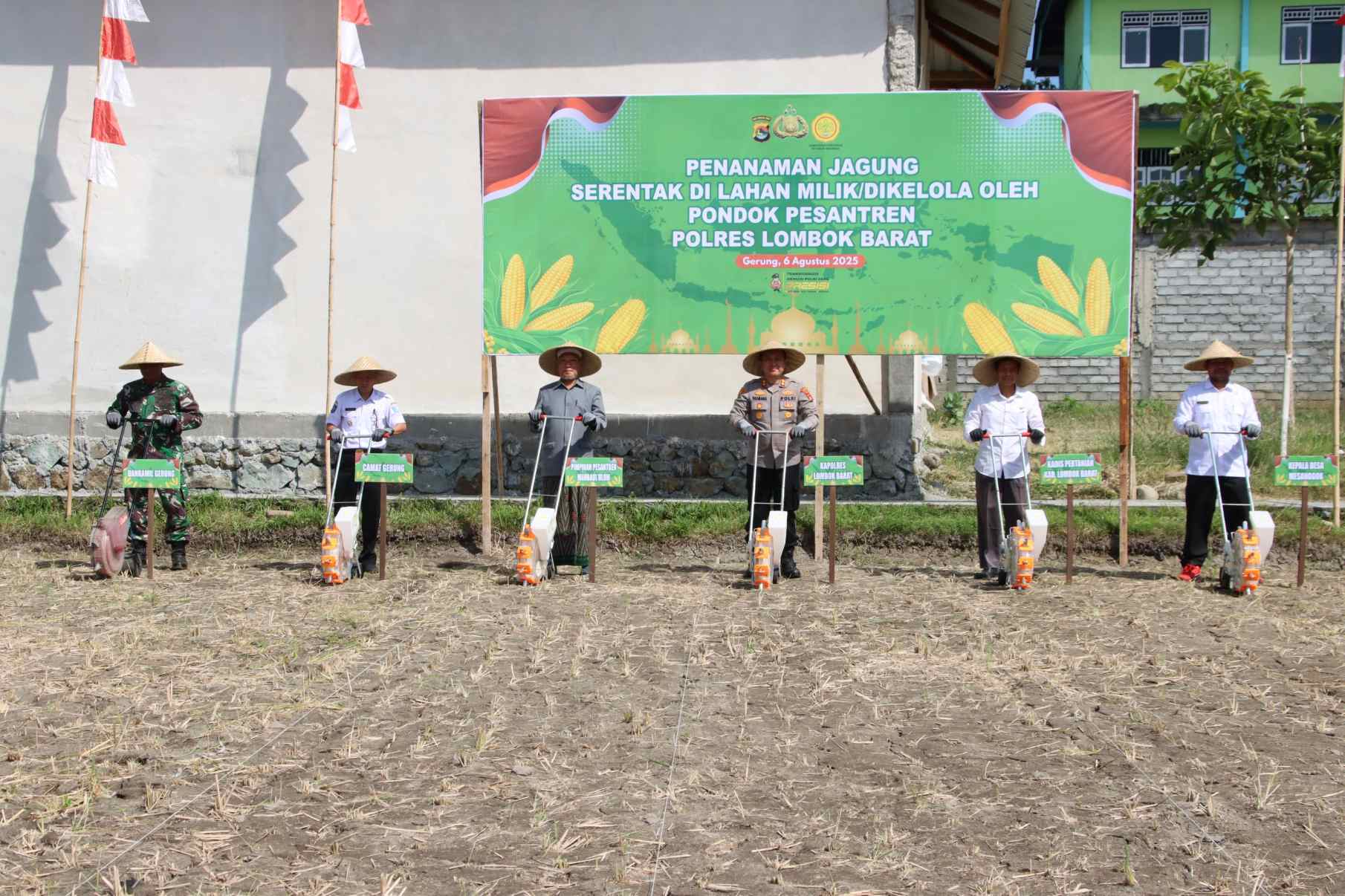 Gerung, Lombok Barat – Kepolisian Resor Lombok Barat (Polres Lombok Barat) bersama dengan Pondok Pesantren (Ponpes) Man’baul Ulum menggelar acara penanaman jagung serentak di lahan milik atau yang dikelola oleh Ponpes yang berlokasi di Dusun Dasan Ketujur, Desa Mesanggok, Kecamatan Gerung, Kabupaten Lombok Barat, Rabu (6/8/2025).