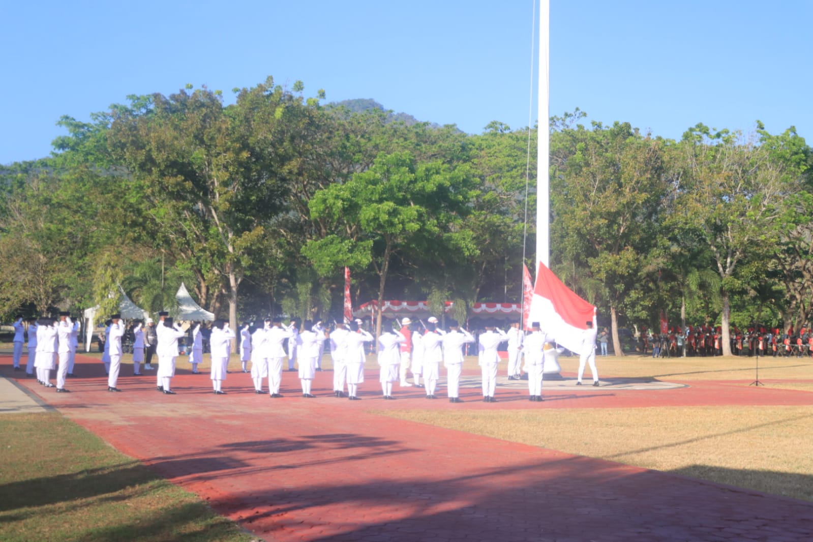Detik-detik pengibaran bendera menjadi momen yang paling sakral, ketika Pasukan Pengibar Bendera Pusaka (Paskibraka) dengan langkah tegap mengibarkan Bendera. Seluruh peserta upacara berdiri dengan penuh hormat, mengumandangkan lagu kebangsaan Indonesia Raya, menyatu dalam semangat persatuan dan kebanggaan sebagai bangsa Indonesia.