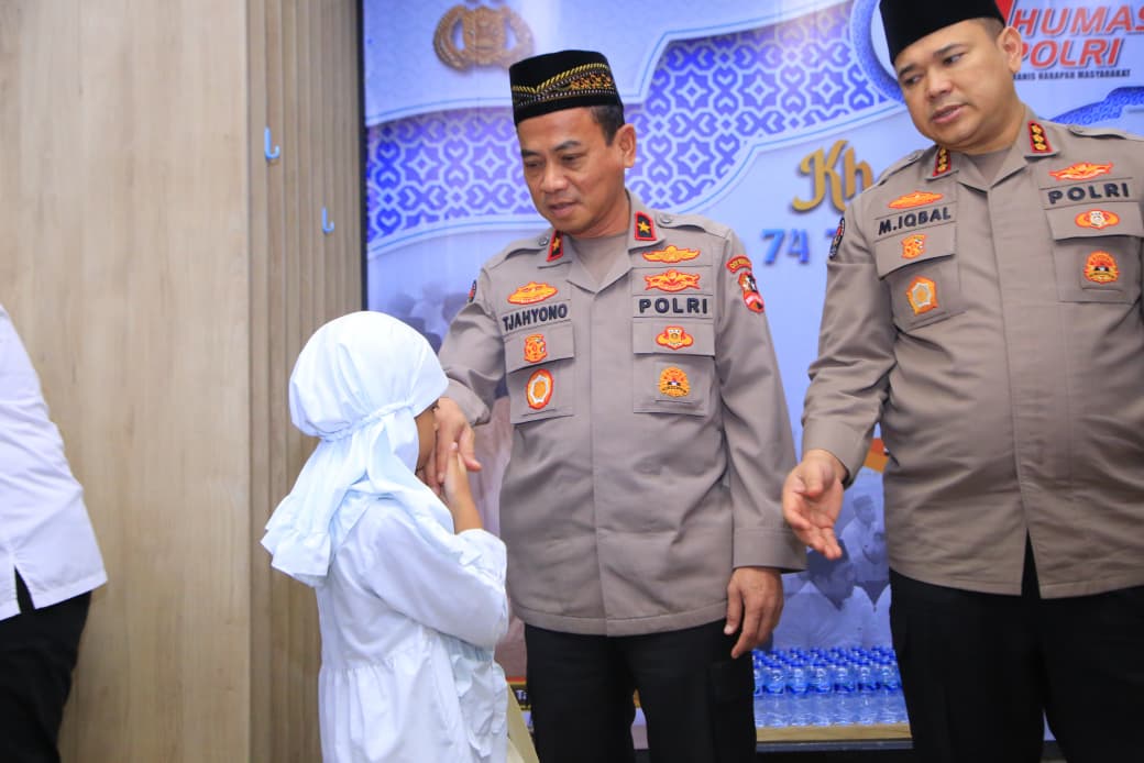 Jakarta. Divisi Humas Polri memberikan tali kasih kepada sejumlah anak yatim dalam rangka Hari Jadi ke-74. Kegiatan ini diselenggarakan usai khataman Al-Qur’an yang melibatkan 74 orang Tahfiz Quran dari sejumlah pesantren beserta personel anggota Divhumas Polri.