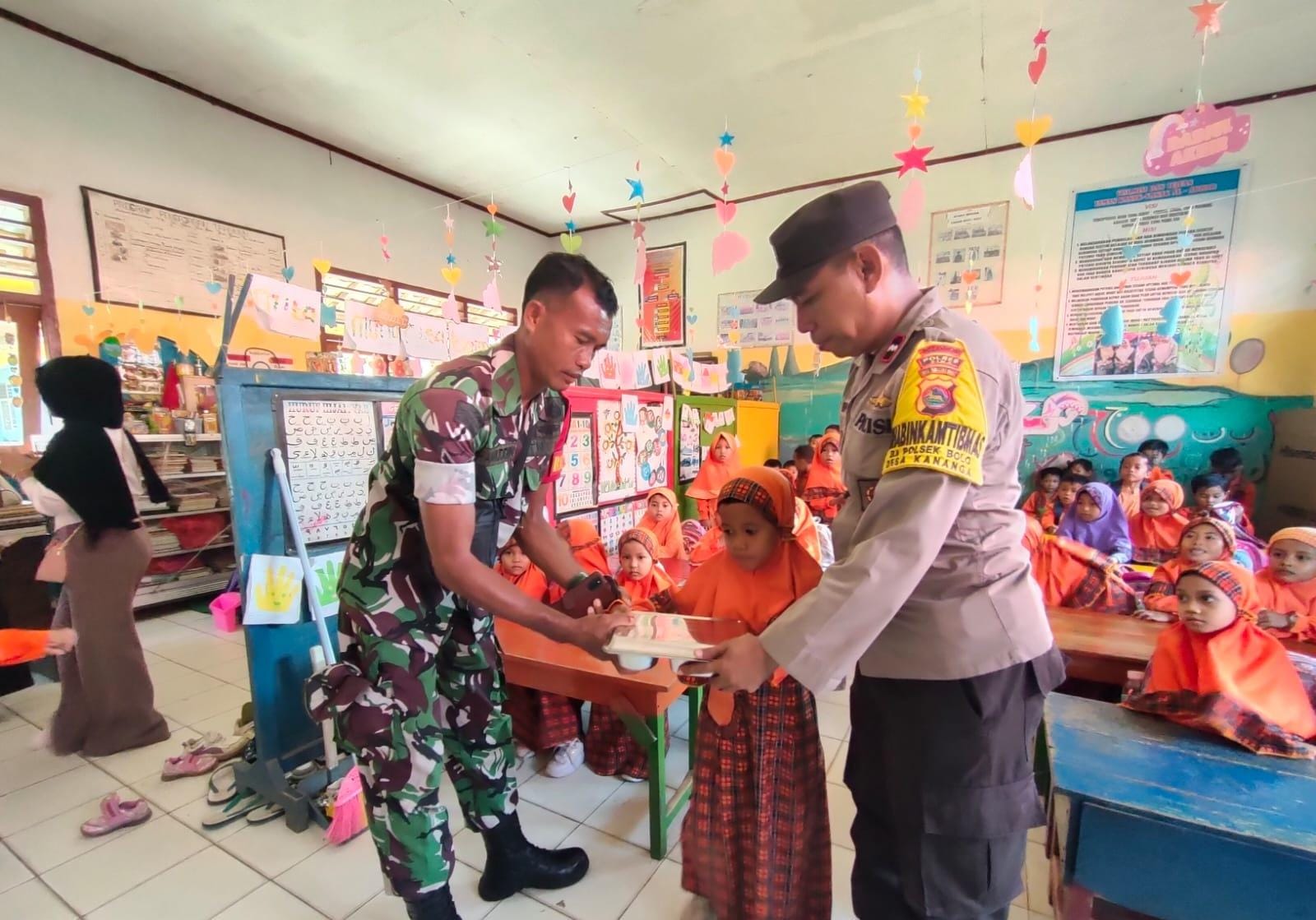 Adib meneruskan, personel Polsek Bolo juga dalam pelaksanaannya ikut serta membantu pertugas SPPG membagikan paket MBG langsung kepada para pelajar.