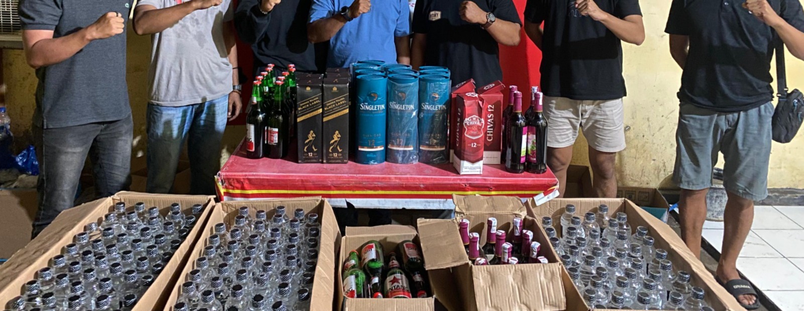 Adapun barang bukti minuman keras yang berhasil diamankan meliputi 10 botol minuman keras merek Singleton, 3 botol Chivas, 5 botol Black Label, 26 botol Bir Bintang, 15 botol Anggur Merah, serta 150 botol arak Bali.