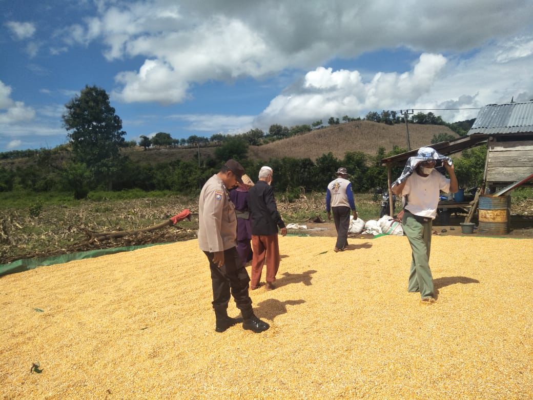 Dalam rangka mendukung program pemerintah di bidang ketahanan pangan nasional, Polsek Manggelewa melalui Bhabinkamtibmas Desa Kwangko melaksanakan kegiatan pemantauan hasil panen dan penjemuran jagung milik warga binaan.